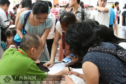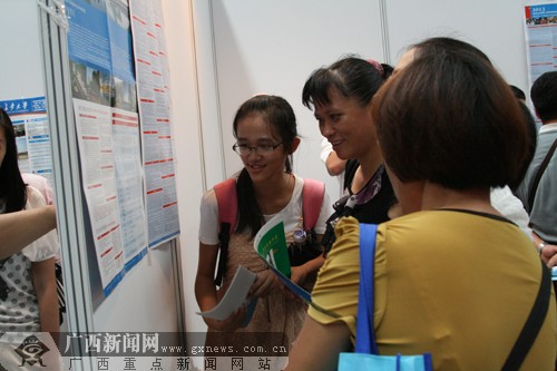 考生及家长在现场进行咨询。广西新闻网实习生 罗丽 摄 考生及家长在了解招生信息。广西新闻网实习生 罗丽 摄 家长现场“取经”填报志愿 记者在现场了解到,咨询会在南宁国际会展中心二楼的3个展厅举办,5号展厅为东北、华东、西南、西北高校展区,6号展厅为广西高校展区,14号展厅为华北、中南、华东和香港高校展区。 高考成绩近日已经公布,考生和家长最关心的是如何填报志愿。咨询会现场,很多家长、考生蜂拥而至,询问志愿填报。中山大学、西南大学等很多院校都被围得水泄不通,招生老师被考生和家长团团围住。“我女儿今天早上刚从云南旅游回来,我很早就去火车站接她直接过来参加咨询会,想多了解一下她看中的几个院校的招生情况。”黄女士告诉记者。黄女士的女儿今年考了理科530分,想报读金融专业,所以专门过来现场"取经","尽量减少填报志愿的风险,毕竟我女儿复读过一年,很不容易。” 现场也有一部分来宾、贺州、桂林的考生和家长前来咨询。来自来宾的小罗,今年考上了文科一本,她想报读广西师范大学。她与姐姐首先去到广西师范大学的展位进行咨询,了解学费、专业、志愿填报等等有关事项。之后他们又继续到其他院校的展位进行了解。贺州的考生小黎,在了解到南宁举行高考招生咨询会后,特意让在南宁工作的表姐去现场了解一下广西民族大学小语种专业。“她的分数不算很高,怕填报民大小语种存在风险,所以我帮她来到咨询会现场咨询。”小黎的表姐表示。