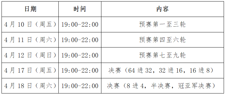 一、主办单位 广西壮族自治区体育局 来宾市人民政府 二、承办单位 来宾市教育体育局 广西社会体育运动发展中心 广西体育高等专科学校 广西体育彩票管理中心 各市、县体育行政管理部门 三、协办单位 广西南国体育赛事有限公司 广西棋云智力运动俱乐部 四、竞赛时间及对弈平台 (一)竞赛时间:2020年3月26日至4月26日。 (二)对弈平台:智赛网(网址www.zhisai.net )。 五、竞赛项目 国际象棋网络赛 六、竞赛办法 (一)比赛分为8个赛区: 1.第一阶段预赛,进行9轮瑞士制,录取前64名进入决赛。 2.决赛:采用淘汰赛赛制(具体对阵另行通知)。 (二)比赛用时:15分钟基本用时,每步棋加10秒。 (三)瑞士制比赛根据积分排列名次。如积分相同,则依次比较1、扣除对手分1型(即扣除对手分中最低得分后的总分);2、对手分;3、索伯分;4、赢棋数(包括弃权得分)。 (四)组委会可根据赛事报名人数等因素对比赛细则、晋级名次等相关事宜进行调整,并提前公布。 七、竞赛日程安排