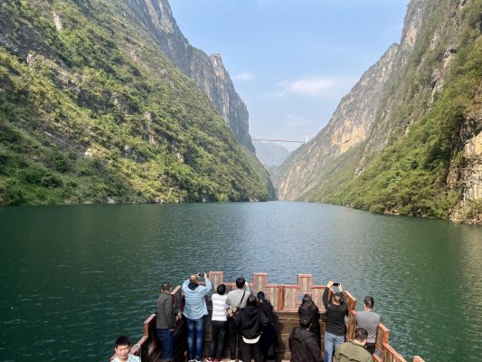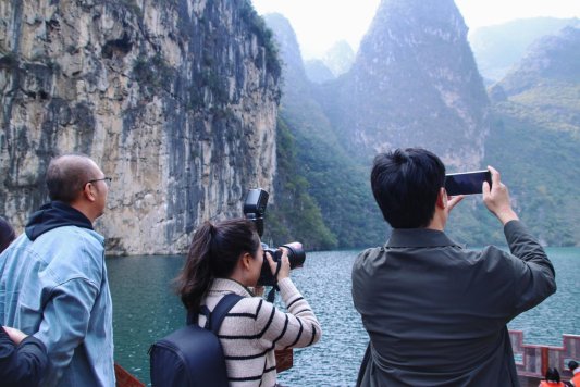 媒体记者拍摄壮美风光 当船缓缓靠近北盘江大桥,眼前的壮观景象引得媒体团欢呼。横跨两岸的北盘江特大桥,桥长388米,高486米,创造了贵州桥梁落差之最,国内桥梁史中也属罕见。从峡谷观赏大桥,可以看到其全貌,让人感叹:“一桥飞架南北,天堑变通途。”从桥上俯瞰大峡谷,又是另一种“天沟地缝”的感觉,峡谷深邃幽长,千余米长的绝壁气势磅礴,令人称奇。 “这边的气候很舒适,比我们那边要暖和很多。江水比较清澈,对于生活在平原的人来说,这样的大山大河比较少见,两岸高差错落有致的峡谷风光非常吸引我。”浙江天目新闻记者陈嘉昀用相机记录下眼前景象。