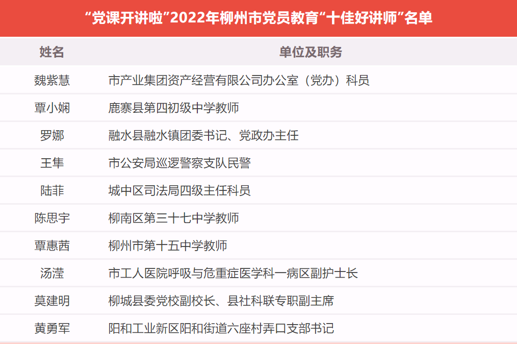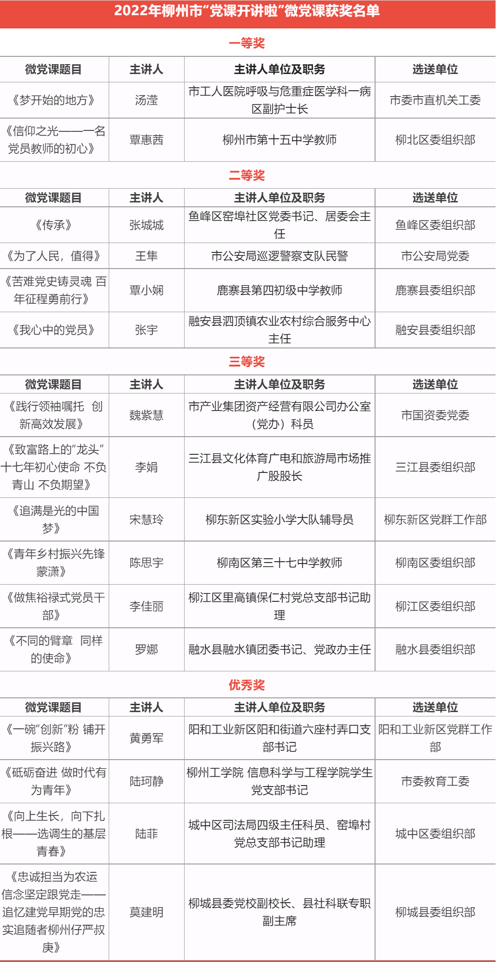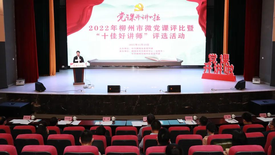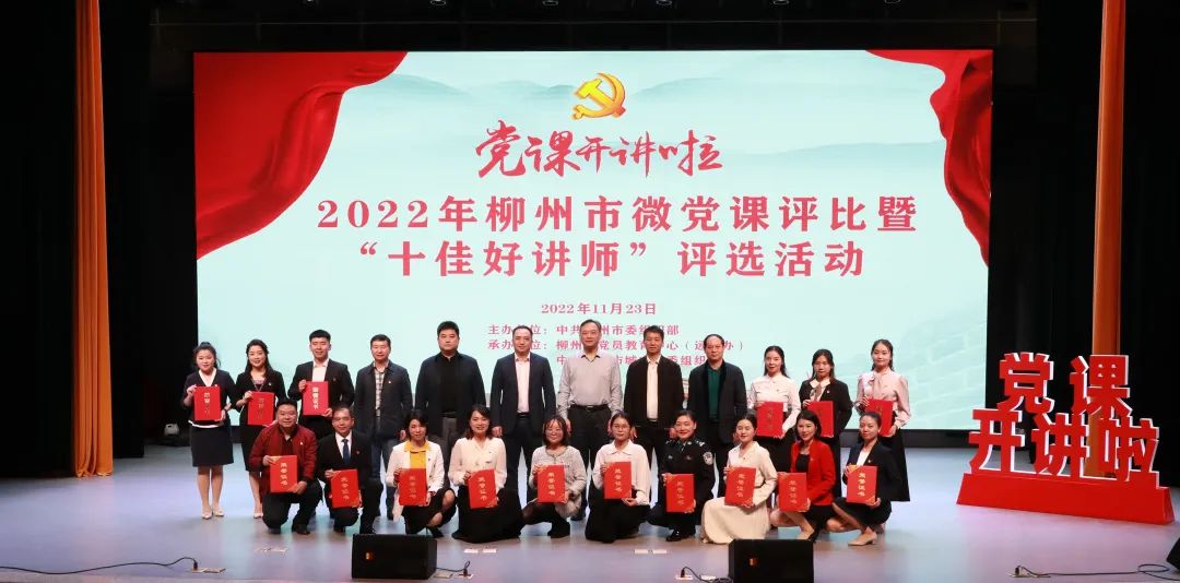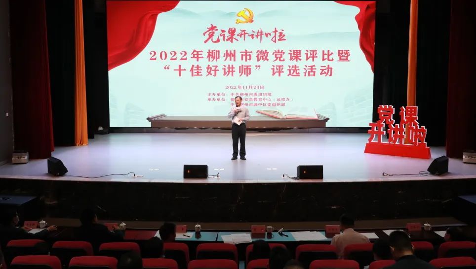 11月23日,2022年柳州市“党课开讲啦”微党课评比暨“十佳好讲师”评选活动在城中区为民服务中心举行,由“党课开讲啦”活动评审委员会对全市各县区(开发区)、市直各党(工)委推荐的16个微党课和16名优秀讲师进行现场评分,经过角逐,最终评选出柳州市党员教育微党课一二三等奖和“十佳好讲师”。