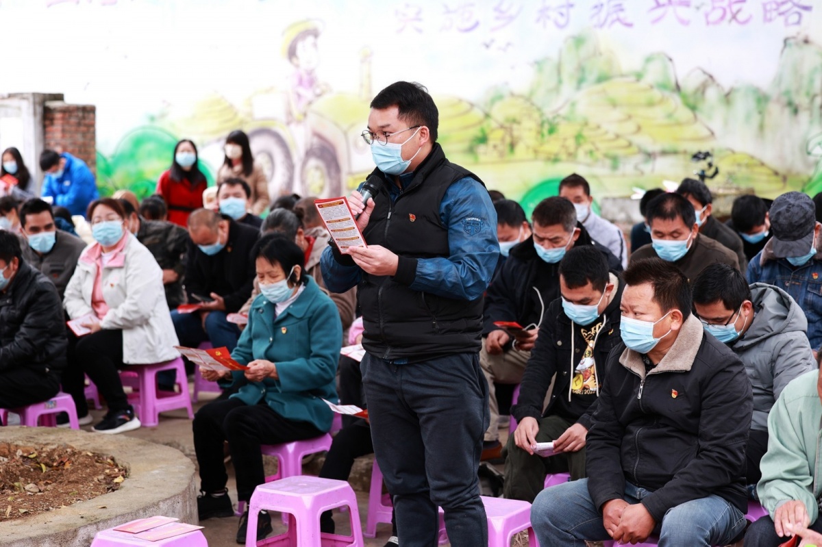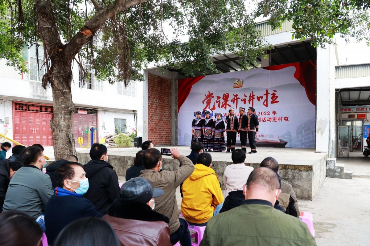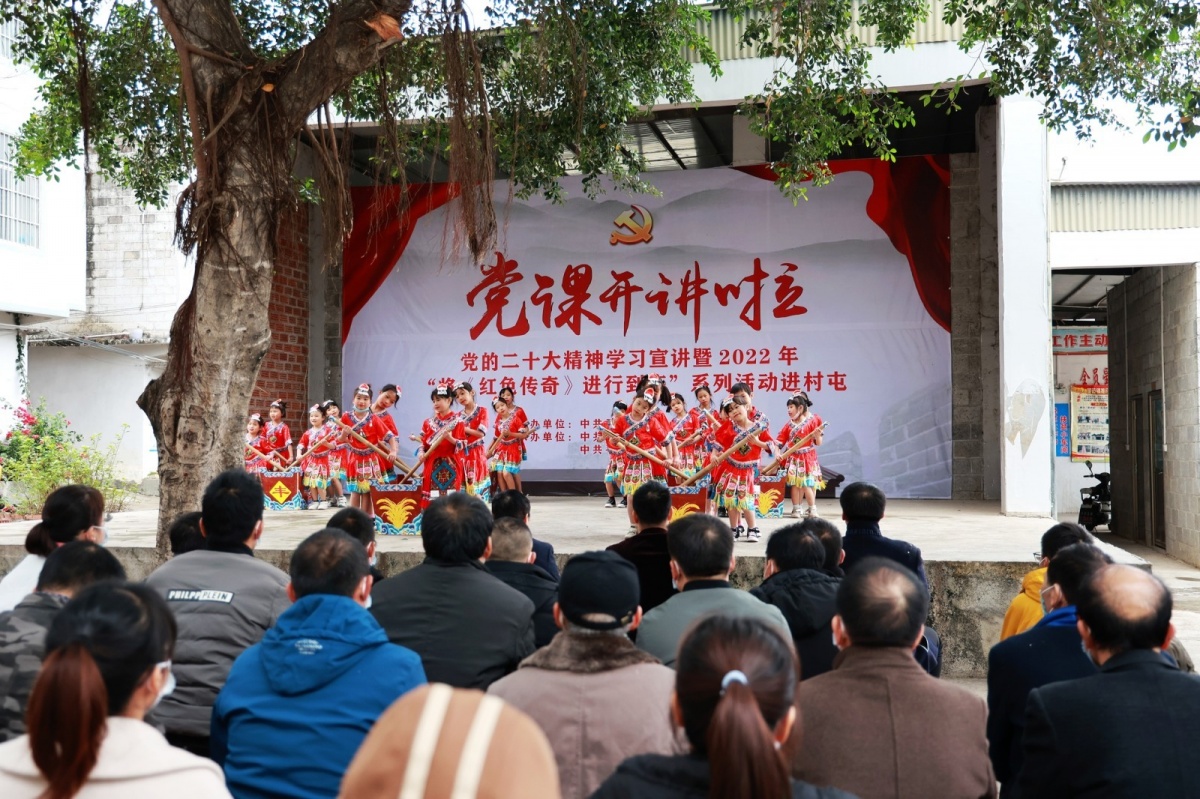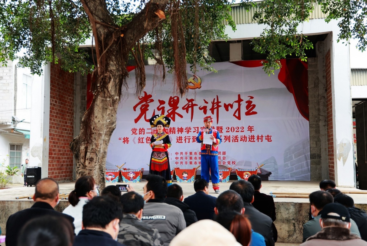 近日,广西壮族自治区百色市平果市坡造镇龙板村举行“党课开讲啦”——党的二十大精神学习宣讲暨2022年“将《红色传奇》进行到底”系列活动。活动中,来自坡造镇中心小学的同学们以精彩的舞蹈表演为活动拉开了序幕。嘹歌歌手高声嘹亮唱响美好生活,赢得了观众们的阵阵掌声。坡造镇龙板村党支书运用当地的瑶族语言,围绕党的二十大的召开背景、大会主题、重要精神等多个内容进行宣讲,并结合当地实际情况,讲解当前的乡村工作,为在场的群众们带来一堂接地气的“乡音”党课,让党的二十大精神入脑入心。