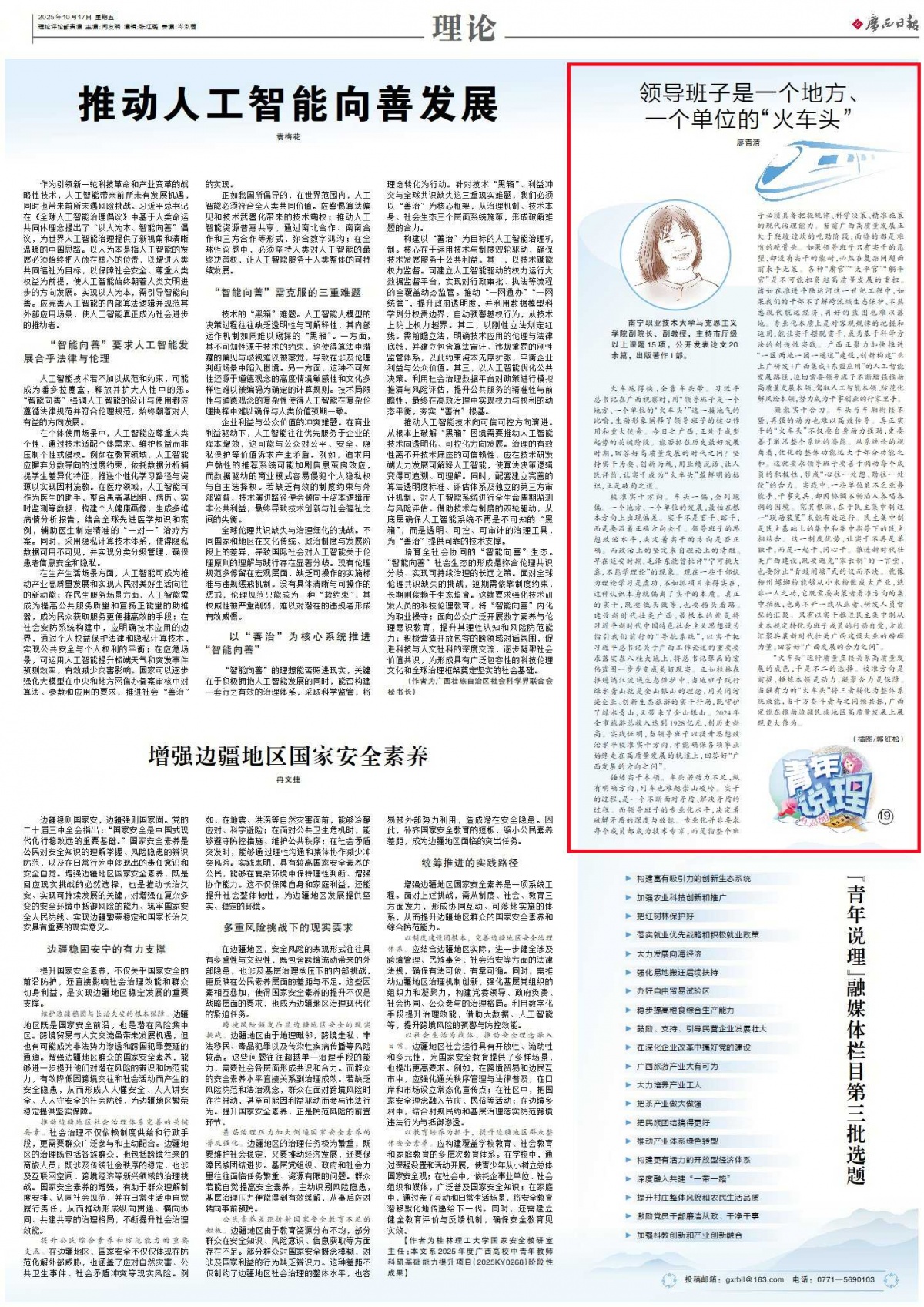 廖青清:南宁职业技术大学马克思主义 学院副院长、副教授,主持市厅级 以上课题 15 项,公开发表论文 20 余篇,出版著作 1 部。 火车跑得快,全靠车头带。习近平总书记在广西视察时,用“领导班子是一个地方、一个单位的‘火车头’”这一接地气的比喻,生动形象阐释了领导班子的核心作用和重大使命。今日之广西,正处于成型起势的关键阶段。能否抓住历史最好发展时期,回答好高质量发展的时代之问?坚持实干为要、创新为魂,用业绩说话、让人民评价,让实干成为“火车头”最鲜明的标识,正是破局之道。 校准实干方向。车头一偏,全列跑偏。一个地方、一个单位的发展,最怕在根本方向上出现偏差。实干不是盲干、瞎干,而是要沿着正确方向去干。领导班子的思想政治水平,决定着实干的方向是否正确。而政治上的坚定来自理论上的清醒。早在延安时期,毛泽东就曾批评“宁可挑大粪,不愿学理论”的现象。现在一些干部认为理论学习是虚功,不如抓项目来得实在,这种认识本身就偏离了实干的本质。真正的实干,既要低头做事,也要抬头看路。建设新时代壮美广西,最根本的就是将习近平新时代中国特色社会主义思想设为指引我们前行的“导航系统”,以实干把习近平总书记关于广西工作论述的重要要求落实在八桂大地上,将总书记擘画的宏伟蓝图一步步变成美好现实。正如桂林在推进漓江流域生态保护中,当地班子践行绿水青山就是金山银山的理念,用关闭污染企业、创新生态旅游的实干行动,既守护了绿水青山,又带来了金山银山。2024年全市旅游总收入达到1928亿元,创历史新高。实践证明,当领导班子以提升思想政治水平校准实干方向,才能确保各项事业始终走在高质量发展的轨道上,回答好“广西发展的方向之问”。 锤炼实干本领。车头若动力不足,纵有明确方向,列车也难越崇山峻岭。实干的过程,是一个不断面对矛盾、解决矛盾的过程。而领导班子的专业化水平,决定着破解矛盾的深度与效能。专业化并非要求每个成员都成为技术专家,而是指整个班子必须具备把握规律、科学决策、精准施策的现代治理能力。当前广西高质量发展正处于爬坡过坎的吃劲阶段,面临的都是难啃的硬骨头。如果领导班子只有实干的愿望,却没有实干的能耐,必然在复杂问题面前束手无策。各种“庸官”“太平官”“躺平官”是不可能担负起高质量发展的重担。诸如在推进平陆运河这一世纪工程中,如果我们的干部不了解跨流域生态保护、不熟悉现代航运经济,再好的蓝图也难以落地。专业化本质上是对客观规律的把握和运用,能让实干摆脱蛮干,成为基于科学方法的创造性实践。广西正聚力加快推进“一区两地一园一通道”建设,创新构建“北上广研发+广西集成+东盟应用”的人工智能发展路径,迫切需要领导班子不断增强推动高质量发展本领、驾驭人工智能本领、防范化解风险本领,努力成为干事创业的行家里手。
