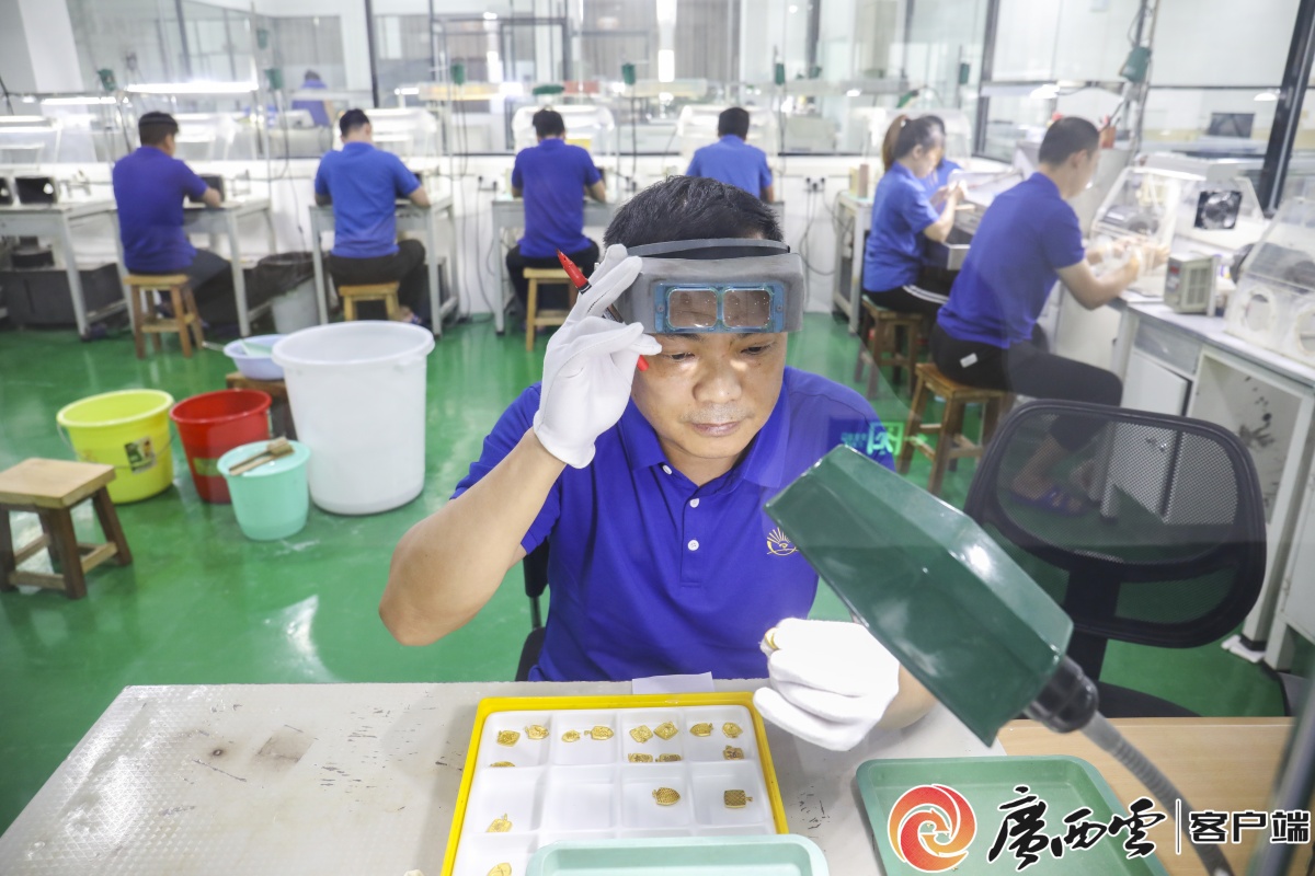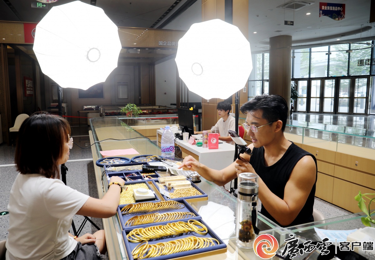 黄金饰品。 像誉金园这样从外地迁入的纯手工高工艺企业,园区已引进6家。截至目前,已进驻企业132家,其中加工企业54家、电商企业30家、配套企业38家、品牌企业及大师工作室10家,形成了从生产加工、精炼提纯到研发设计、销售贸易的全产业链闭环。 “双链融合”激发产业新动能 在平桂区,一场关于创新链与产业链深度融合的实践正在悄然上演。 园区内,机器轰鸣声中,设计室的3D建模屏光闪烁,工匠手持激光雕刻笔精准雕琢。古法金、珐琅彩黄金、3D硬金、5G黄金……新工艺、新材料不断涌现,展现出高技术、高效能、高质量的新质生产力特征。 “我们持续开展全产业链招商,重点引进黄金冶炼、精炼加工、电商直播、品牌设计等类型企业,打造集生产加工、贸易销售、交易展览、研发设计等功能为一体的全产业链生态园区。”平桂区委副书记、区长周诚说。 在创新链方面,平桂区与贺州学院、桂林理工大学等高校共建产业学院、实习基地,推动产学研合作。目前,产业园内已有多家企业建立研发中心,研发投入占销售收入的比例逐年提高。 顾客前来挑选购买黄金饰品。 在产业链方面,贺州创新打造“超级工厂+供应链+终端门店”的全产业链供销模式,形成从生产到消费的“极短链路”。这一模式减少了物流、总销、分销等中间环节,使生产更精准、价格更实惠。今年4月,平桂黄金珠宝产业单月销售额突破3亿元,充分展示这一模式的巨大潜力。