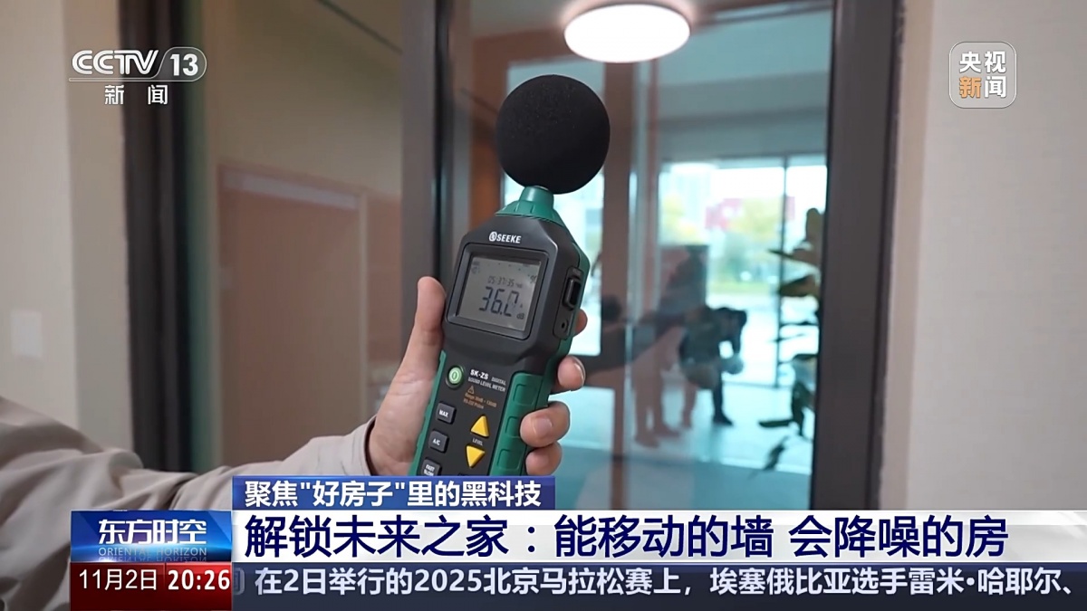 隔音效果也是好房子的一个重要指标。窗外有人在拍球,噪声有70多分贝,把窗户关上,由于房屋采用的是隔音效果较好的墙体和中空玻璃,室内噪声迅速降到了30多分贝。