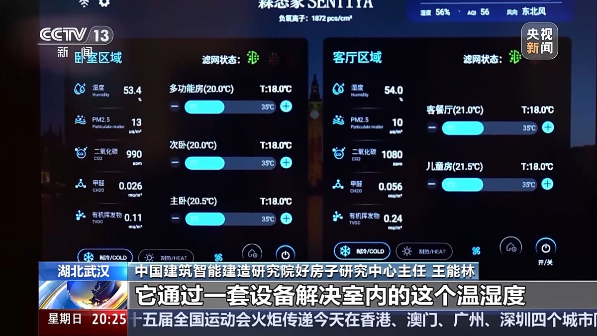中国建筑智能建造研究院好房子研究中心主任 王能林:六恒空气系统,它通过一套设备解决室内的温湿度、PM2.5、二氧化碳、甲醛、有机挥发物以及整个负氧离子的整个指标控制,可以模拟不同气候条件的空气室内环境。不管是从北方到南方,还是从国外到中国都可以让人感到在家一样的感觉。