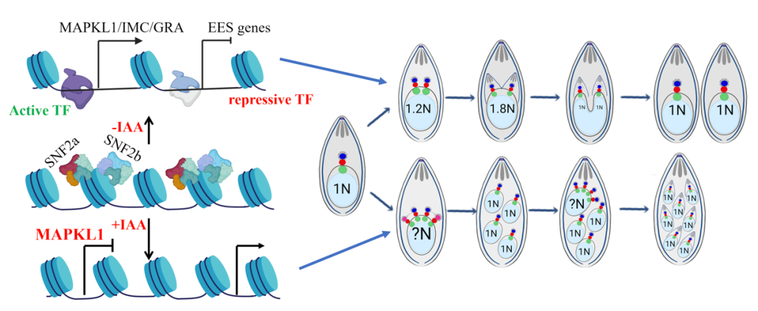 弓形虫病是由弓形虫寄生引起的一种重要人兽共患病,其生命周期极为复杂,有多种发育阶段,能够在人和猫等不同宿主中进行“身份”切换(比如致病的速殖子、潜伏的缓殖子),还会切换分裂方式(速殖子1分2,裂殖子1分N)。在之前的研究中只知道有个“抑制器”(MORC复合体)能关掉不该有的“身份基因”,但一直不清楚谁是“激活器”——负责打开速殖子自身必需的基因,维持它的正常身份和分裂。调控其不同阶段分裂方式转换的核心机制尚不明确,这也是该领域研究的瓶颈问题。 针对这一难题,研究团队取得了三个核心新进展: 找到了“激活器”。首次揭示SWI/SNF染色质重塑复合体是维持弓形虫速殖子分裂方式所必需的核心激活因子。两个复合体的核心亚基SNF2a和SNF2b是弓形虫速殖子阶段生长所必需的。当复合体功能缺失时,寄生虫的分裂模式会从有序的“一分为二”向混乱的“一分为多”发生转变,并错误地启动了本应被抑制的其他发育阶段的转录程序。SWI/SNF复合体作为染色质重塑因子,通过维持速殖子关键基因转录起始区域的染色质开放性来确保其正常表达,并与已知的抑制因子MORC复合体协同作用,实现了对基因表达的双重调控,从而确保寄生虫基因表达和分裂过程的准确性。 揭秘“身份维稳”功能。如果没有SWI/SNF复合体,速殖子会“身份错乱”——本该1分2的分裂变成1分N的异常模式,还会长出多个细胞核、积累不该有的淀粉颗粒,最后走向死亡。 弄清分子机制。SWI/SNF会主动“打开”速殖子自身基因的开关(让染色质变开放),同时还会和“抑制器”MORC合作,一起关掉裂殖子的基因,双重保障速殖子不“串味”。