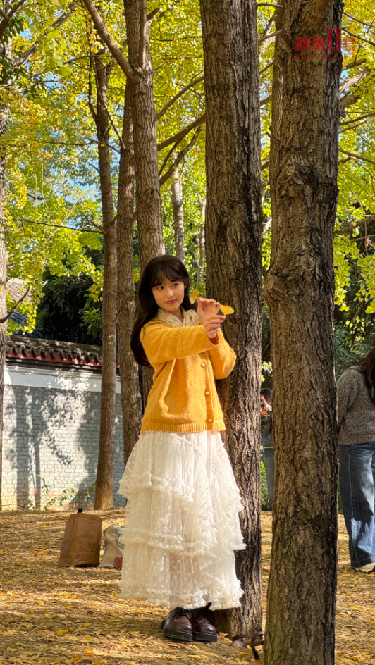 “往年都只是路过,今年特意穿了同色系的裙子来拍照,这满树的金黄太治愈了。”游客林女士笑着展示手机里的照片。身着古风汉服的姑娘手持银杏叶,在摄影师的镜头前舒展衣袖,鹅黄裙摆与金黄叶片相映成趣。年轻游客蹲坐树下,将银杏叶轻铺在翻开的书页上,将秋意定格入卷。