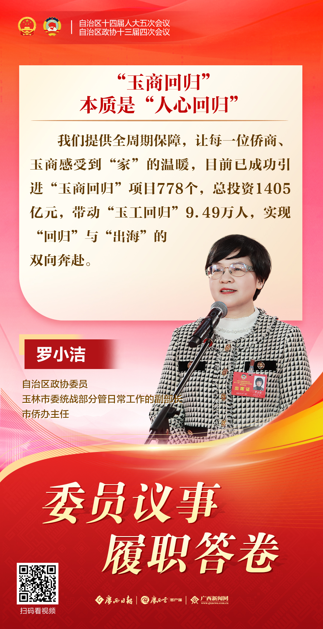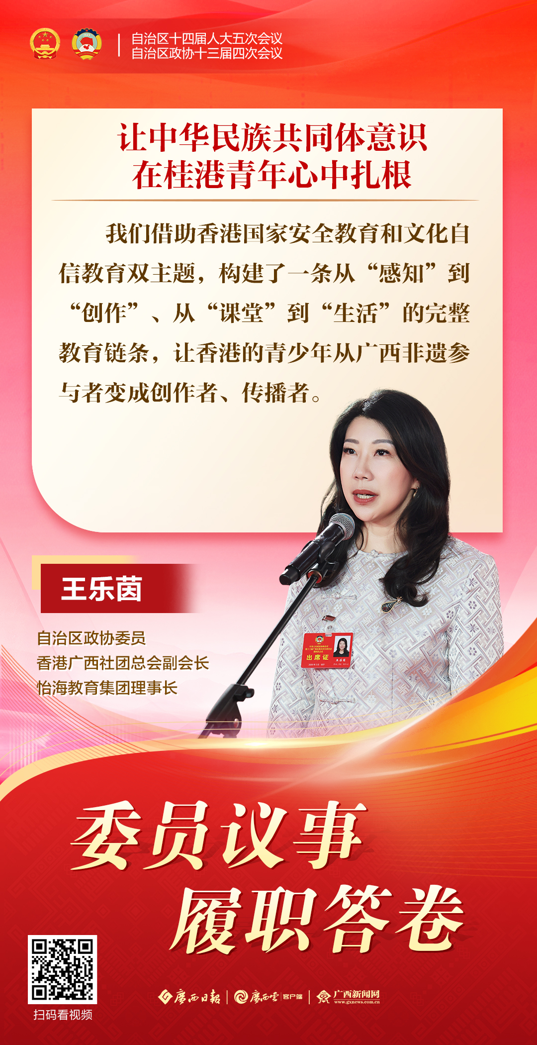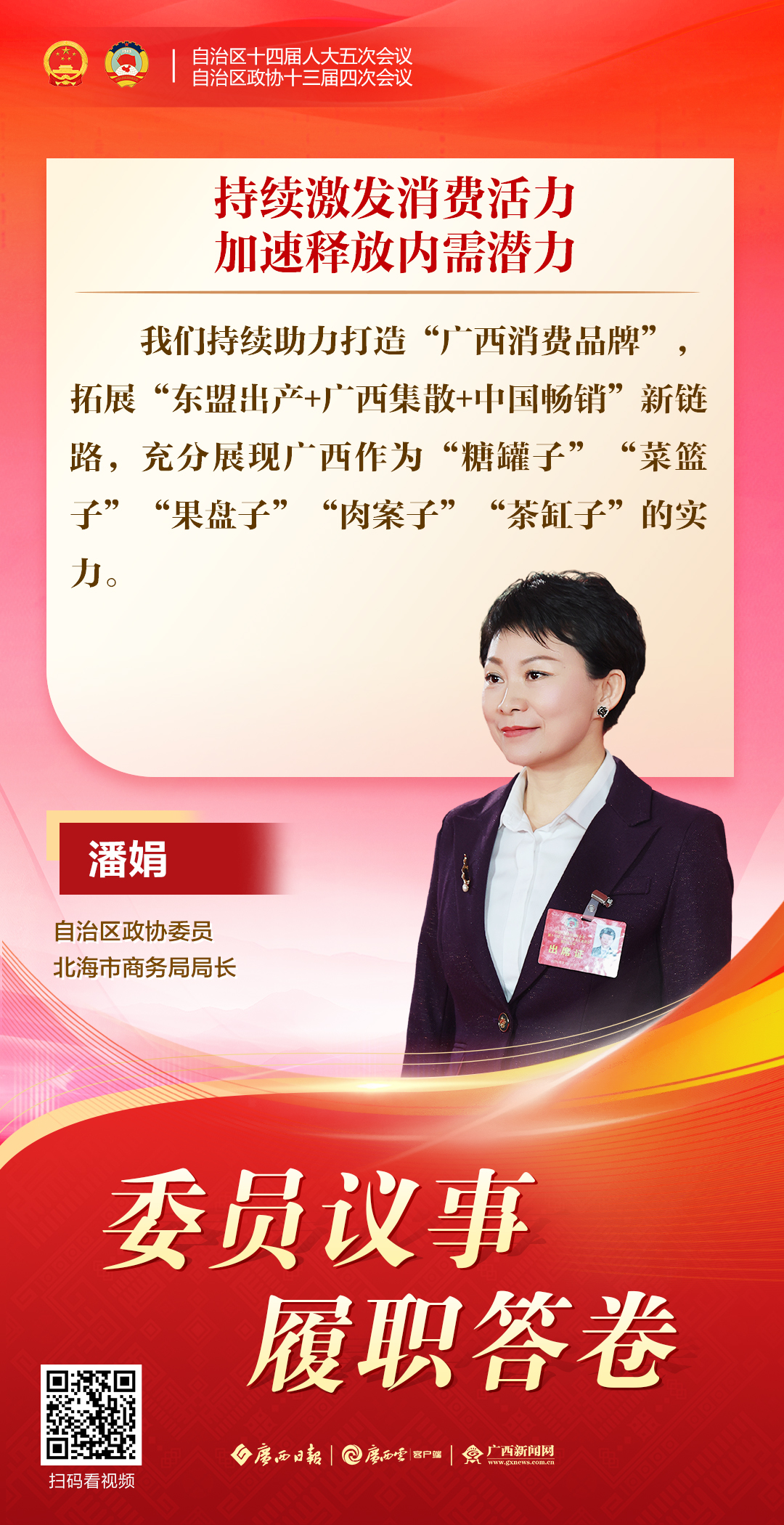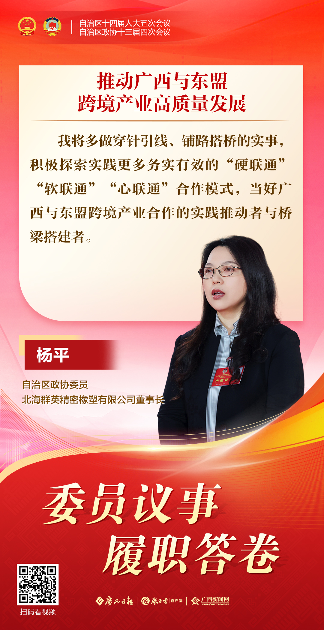 2月4日,自治区政协十三届四次会议举行第二场“委员议事”集中采访。杨平、王乐振、王乐茵、罗小洁、潘娟、刘建明6位来自不同界别的自治区政协委员,围绕跨境合作、绿色发展、文化交流、“玉商回归”、提振消费、人工智能等热点议题,与媒体畅抒履职心声,传递民生期盼,彰显委员担当。 一起来扫描海报二维码,直达采访现场,聆听委员心声!